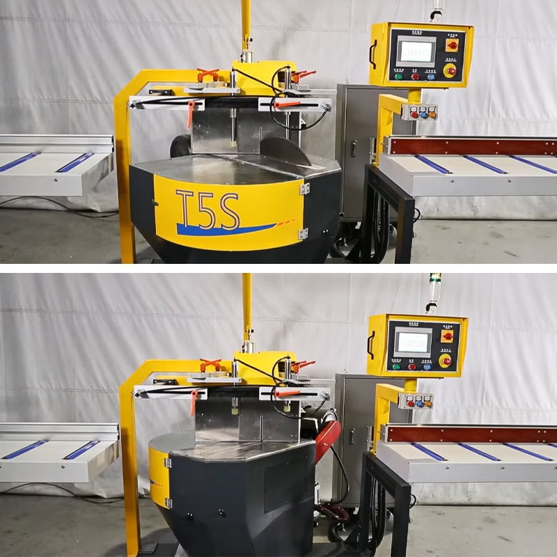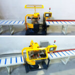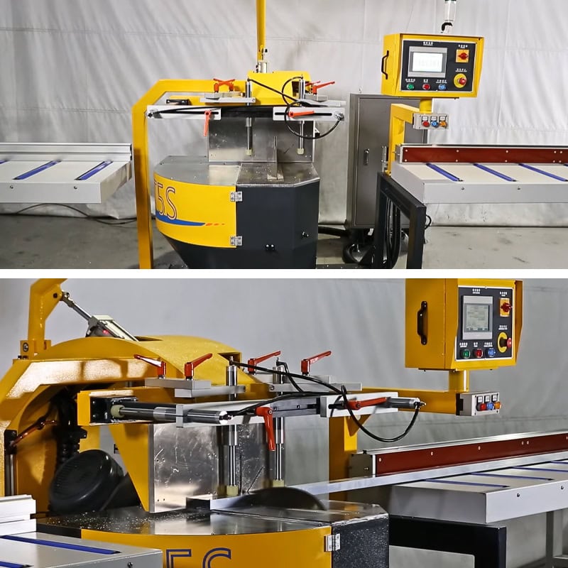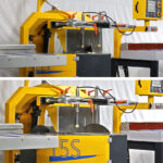 5 Axis Automatic Single Head Tilting & Rotary Sawing Machine. The standalone worktable allows for flexible operation and can be equipped with either manual or automatic positioning and feeding systems, enabling precise alignment and cutting. The machine supports automatic diagonal rotation between 22.5° and 157.5°, as well as vertical tilting from 0° to 45°.